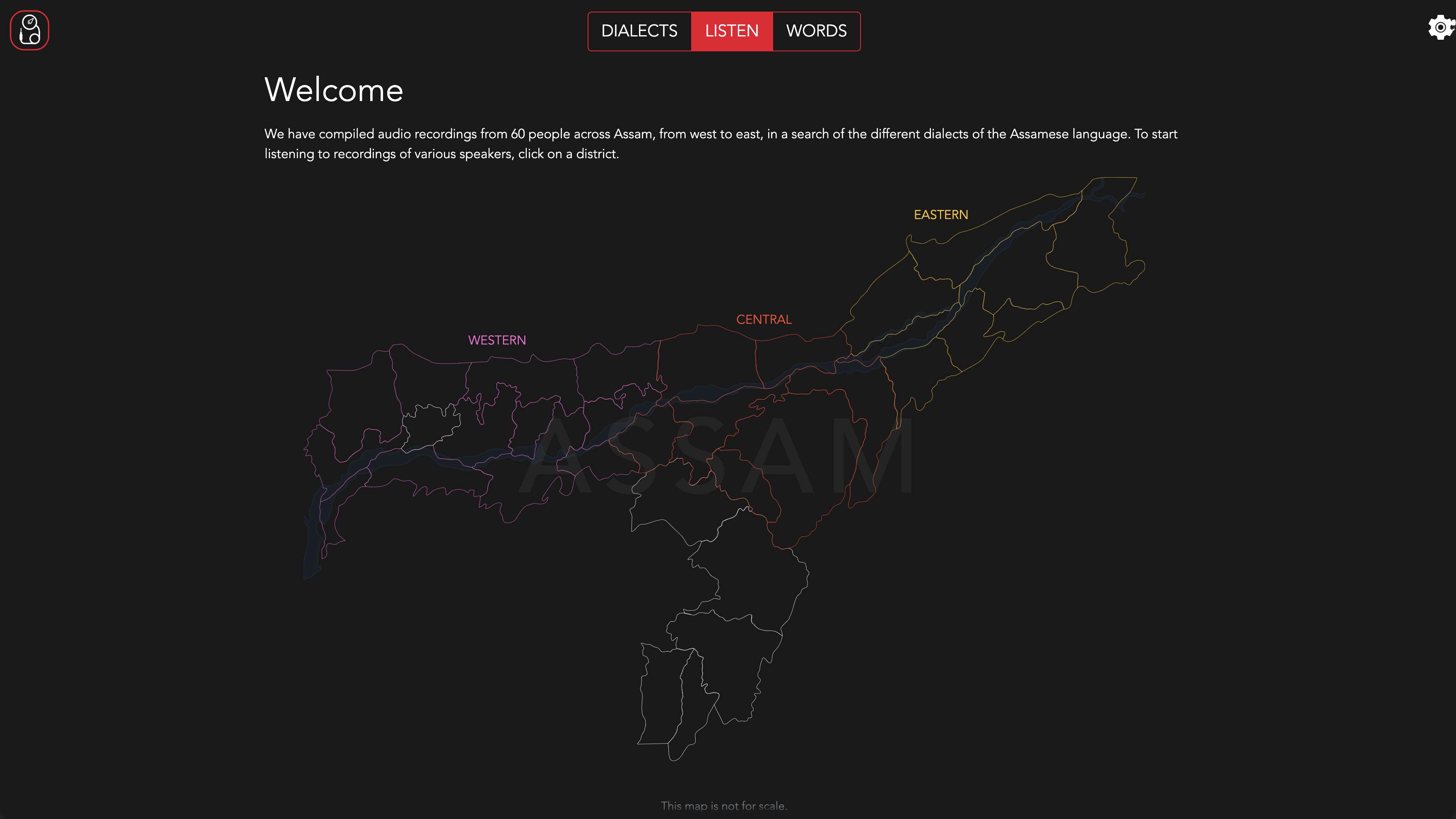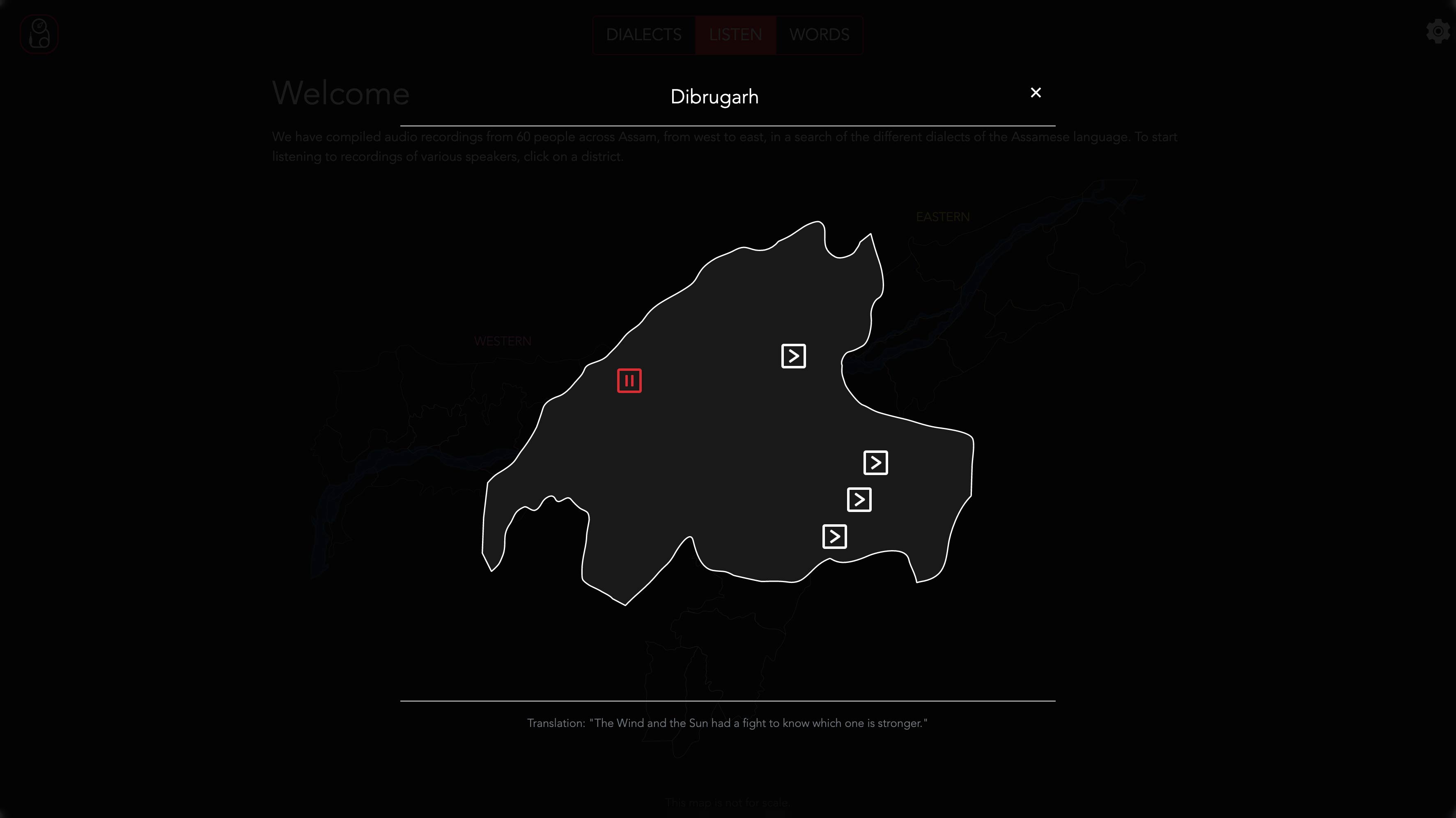 The user can listen to speech recordings from various districts of Assam. These, when clicked, show a pop-up with multiple play buttons placed accurately.