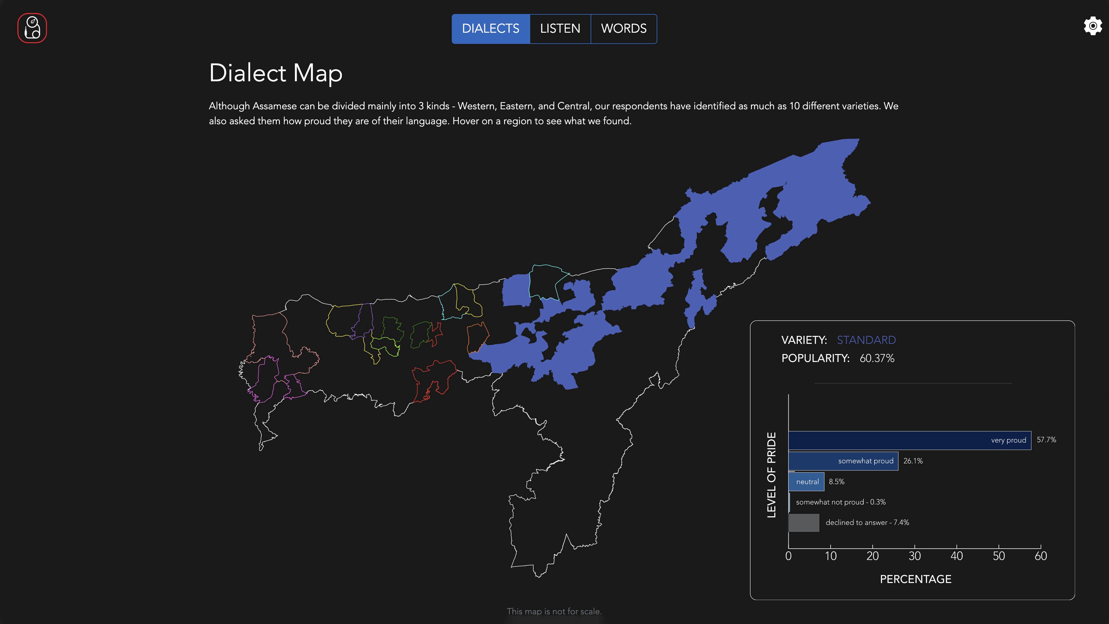 Shows the different dialects across the state. One can hover over a region to see what variety they speak, their popularity and how proud they are of their language.