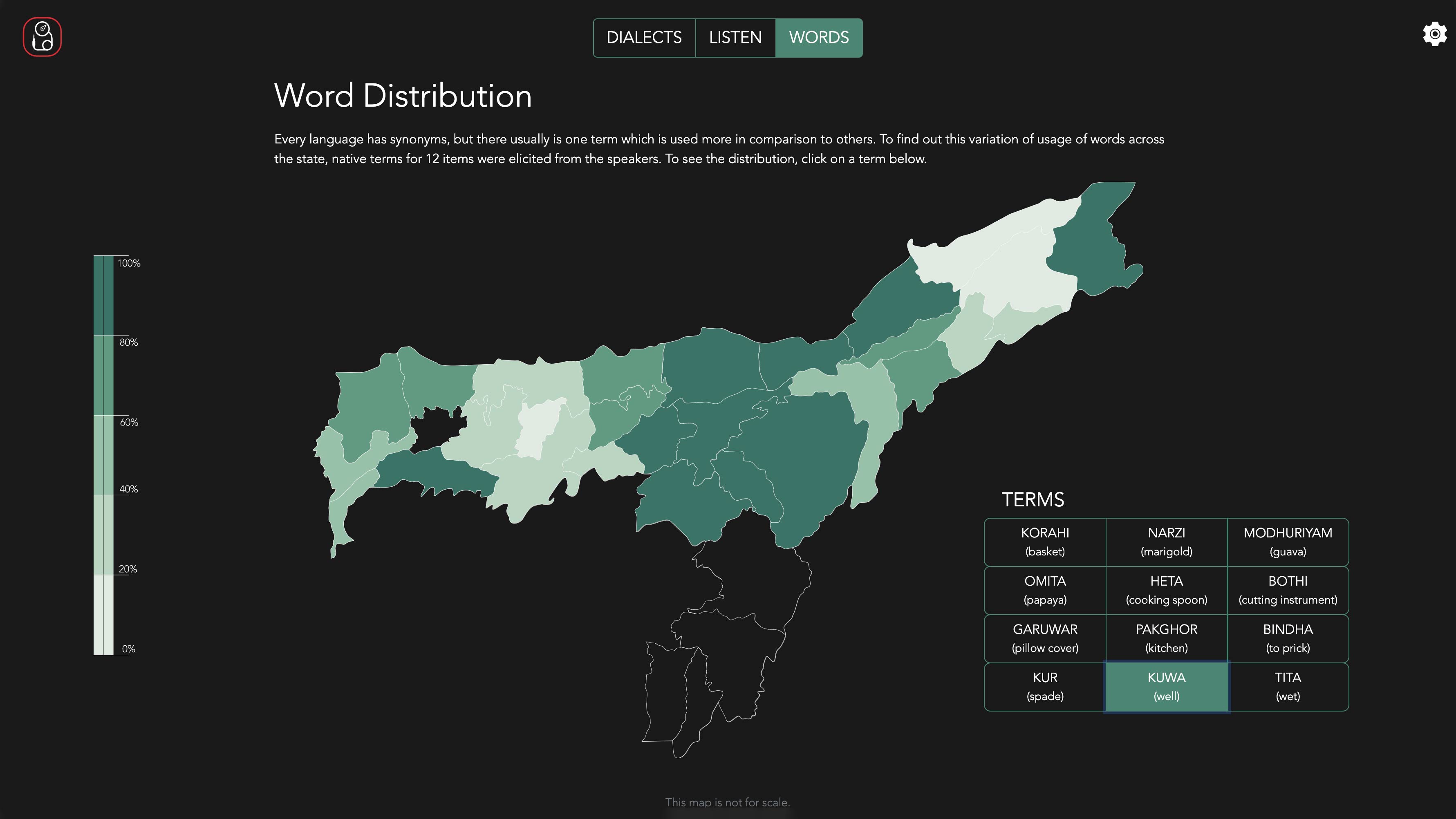 Shows the distribution of lexical terms. Twelve terms were selected, which had multiple synonyms to study the usage of these words in different regions. We put these terms in a grid, and we showed the distribution using a gradient. The darker the shade, the more frequent the word was used in that region.