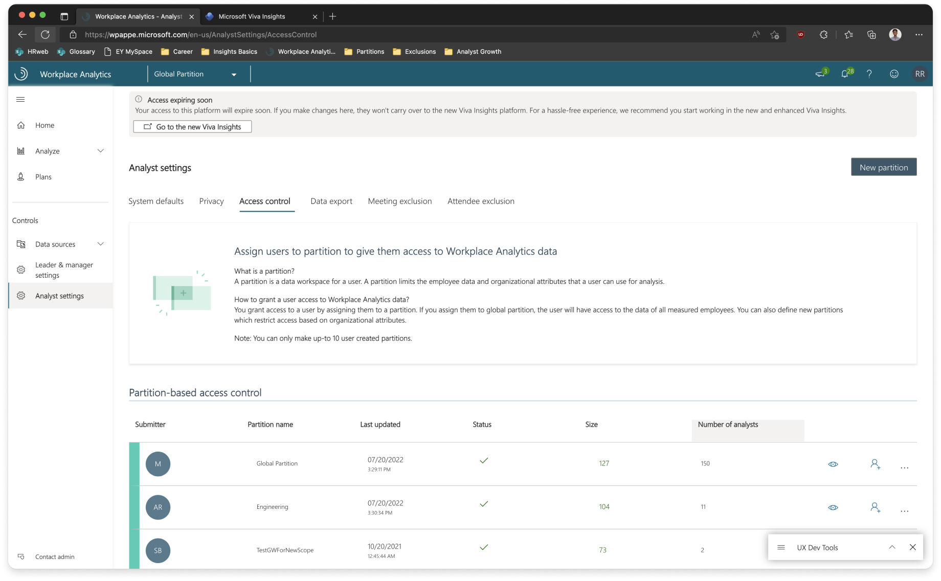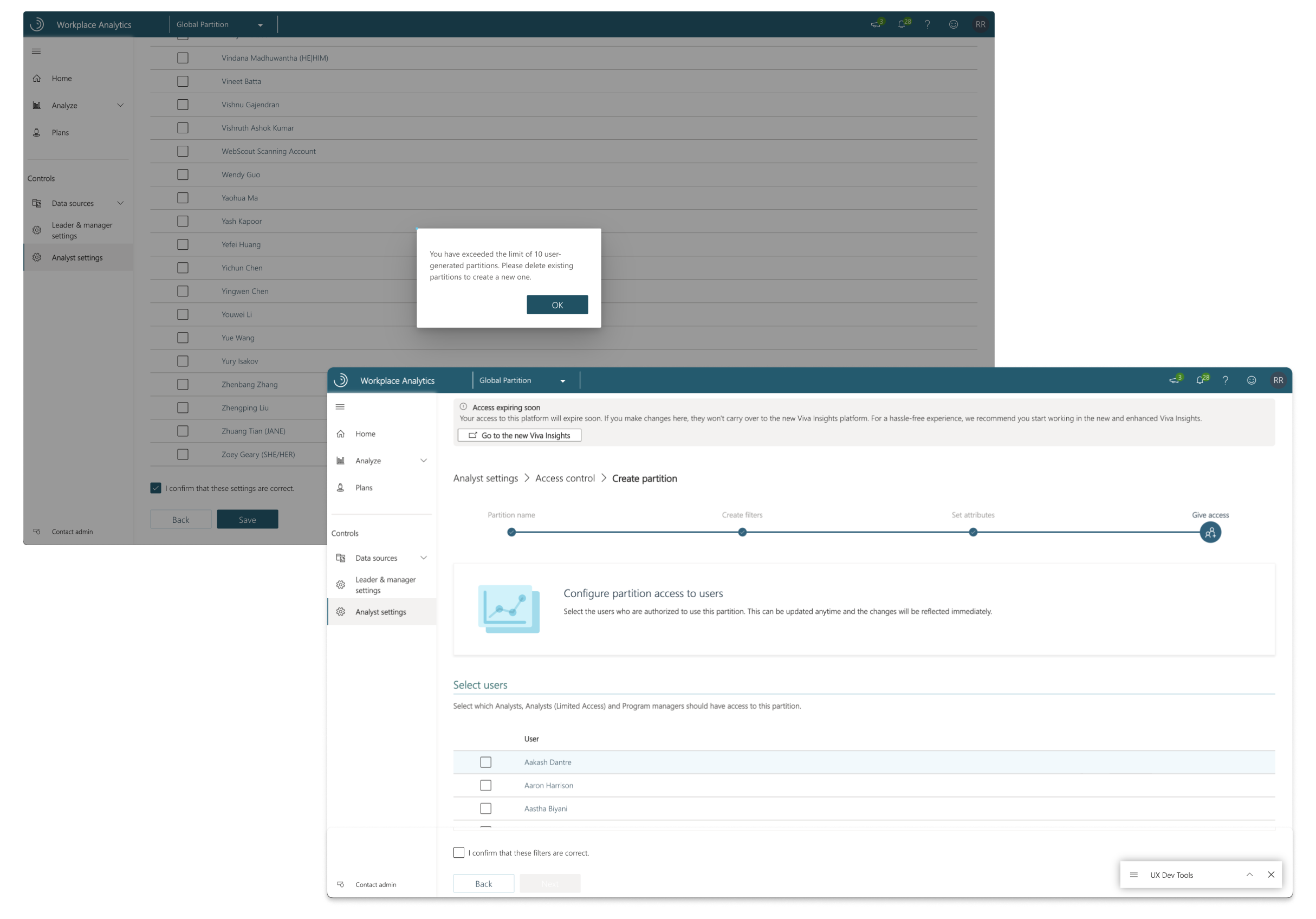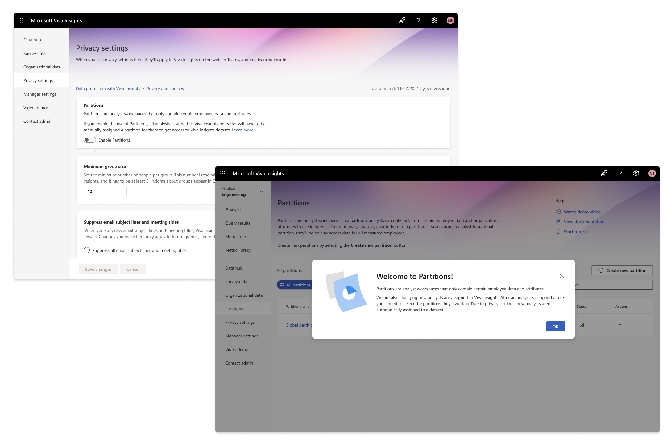 The final part of our puzzle was figuring out how to let admins enable Partitions for their tenant. The tricky part over here is that, once Partitions is enabled, analysts will have to be manually assigned to at least one partition to work on Viva Insights and conduct analysis. This is a shift in paradigm for the admins as before Partitions, any analyst who was assigned Viva Insights in the Microsoft Admin Center, will automatically get access to all data.