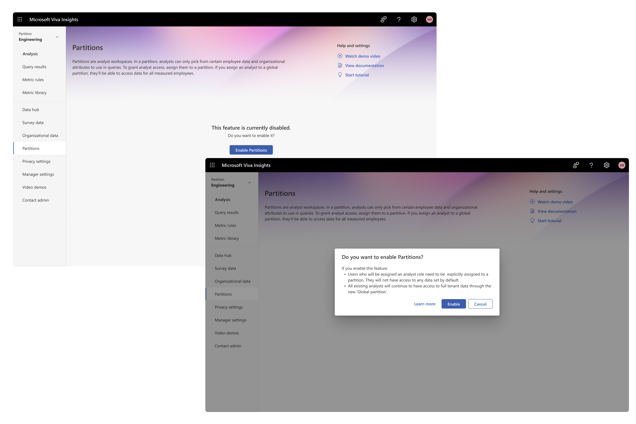 We then explored an experience where the admin can enable the setting through the Partitions homepage. This gives the admin an explicit message on what will happen when Partitions is enabled for their tenant.