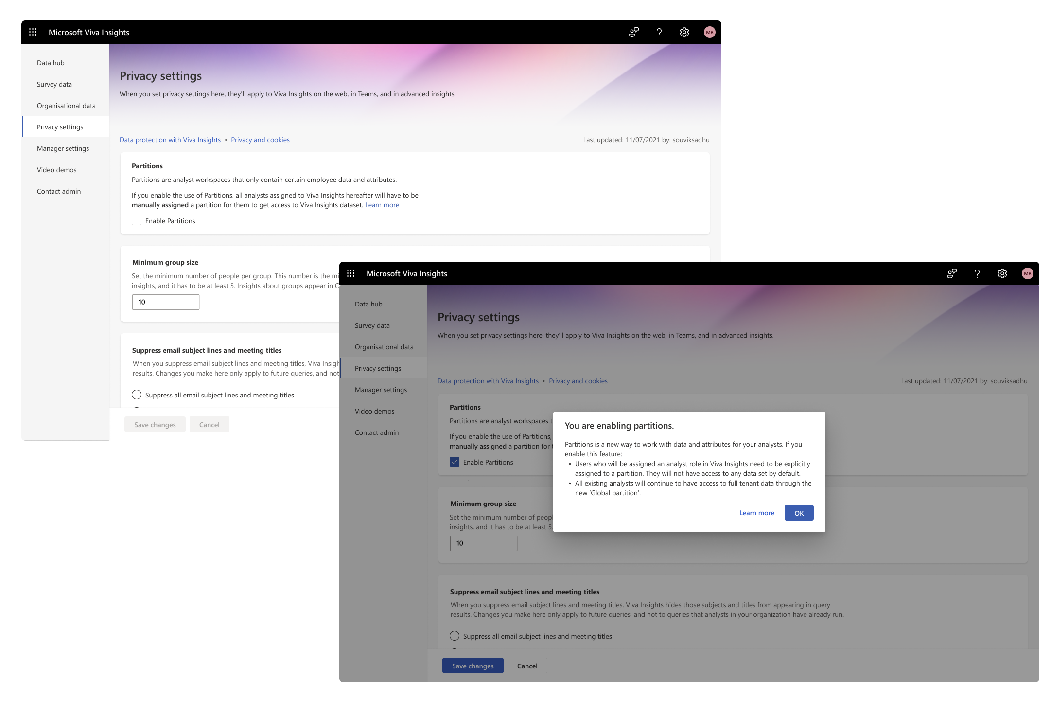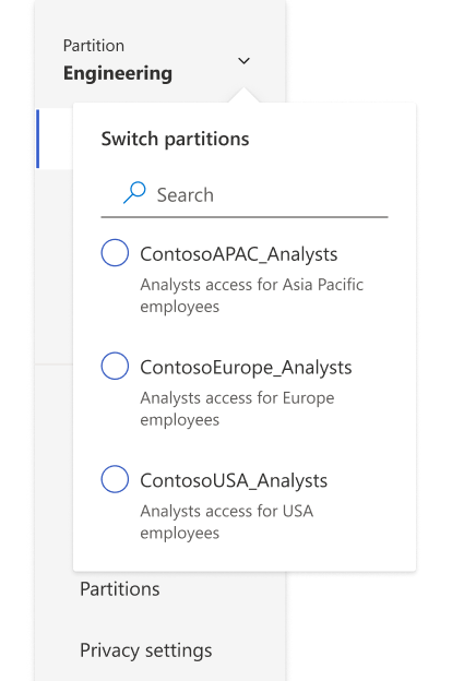 This brought us to the final experience which got shipped. Over here, the user has to navigate to Privacy settings and toggle on Partitions to enable it for their tenant. Once toggled, the user will be presented with a info modal, which explains how it will affect the tenant.